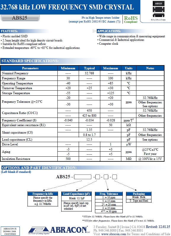 Abracon晶振 | 單位 | ABS25晶振 | 石英晶振基本條件 |