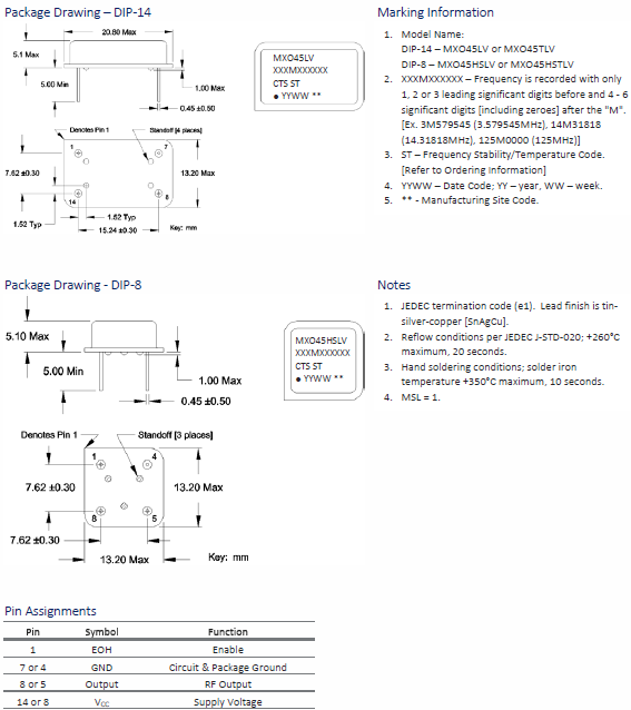 MXO45HSLV-3C-45M0000 | CTS晶振 | MXO45HSLV | 45MHz | ±50ppm | 8-DIP, 4 Leads (Half Size, Metal Can) |