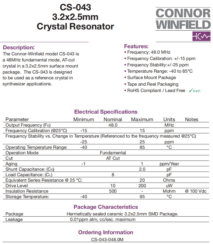 CS-043-048.0M | ConnorWinfield | CS-043 | MHz Crystal | 48MHz | ±25ppm |