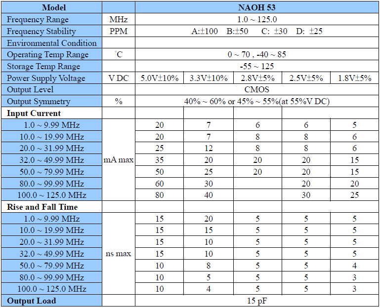臺灣津綻晶振,NAOH-53振蕩器,5032mm貼片晶振,尺寸大小5.0*3.2*1.3mm,CMOS輸出晶體振蕩器,頻率范圍1.0 to 125.0MHZ,工作溫度-40~+85℃耐高溫環(huán)境,無縫焊接具有,優(yōu)良的可焊性,符合無線環(huán)保要求,該款SMD振蕩器主要應(yīng)用于:PCMCIA卡,CCD,便攜式電,無線局域網(wǎng).