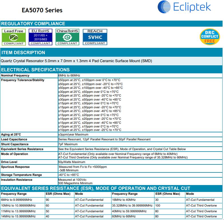 AT-Cut Fundamental (Only available over Nominal Frequency range of 6MHz to 40MHz) AT-Cut Third Overtone (Only available over Nominal Frequency range of 35.328MHz to 66MHz) |