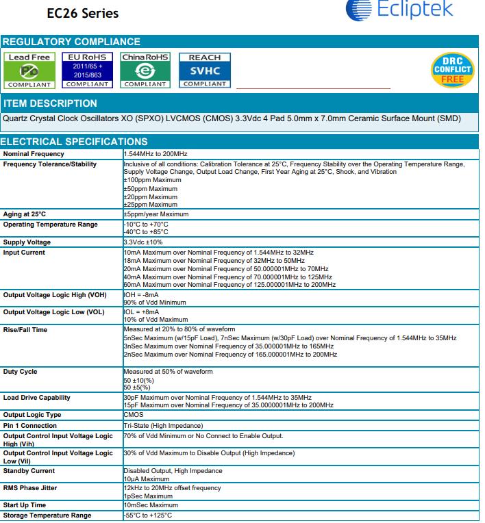 EC26石英晶體振蕩器,ECLIPTEK晶振,EC2600ETTTS-20.000M-TR晶振,小型SMD有源晶振,從最初超大體積到現(xiàn)在的7050mm,6035mm,5032mm,3225mm,2520mm體積,有著翻天覆地的改變,體積的變小也使產(chǎn)品帶來了更高的穩(wěn)定性能,接縫密封石英晶體振蕩器,精度高,覆蓋頻率范圍寬的特點(diǎn),SMD高速自動(dòng)安裝和高溫回流焊設(shè)計(jì),Optionable待機(jī)輸出三態(tài)輸出功能,電源電壓范圍:1.8V~5V,高穩(wěn)定性,低抖動(dòng),低功耗,主要應(yīng)用領(lǐng)域:無線通訊,高端智能手機(jī),平板筆記本W(wǎng)LAN,藍(lán)牙,數(shù)碼相機(jī),DSL和其他IT產(chǎn)品的晶振應(yīng)用,三態(tài)功能,PC和LCDM等高端數(shù)碼領(lǐng)域,符合RoHS/無鉛.