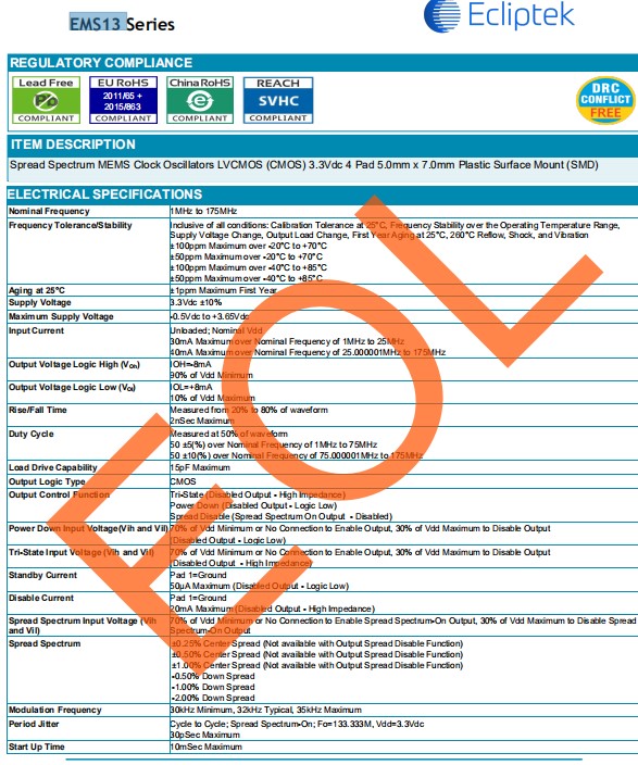 ECLIPTEK晶振公司將有效率的使用自然資源和能源,以便從源頭減少廢物產生和排放.我們將在關注于預防環境和安全事故,保護公眾健康的同時,努力改進我們的操作.我公司將積極參與加強公眾環境、健康和安全意識的活動,提高公眾對普遍的環境、健康和安全問題的注意. EMS13時鐘振蕩器,ECLIPTEK日蝕晶振,EMS13CHA-16.000M-TR晶振.