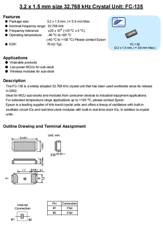 Q13FC1350000500 | 3.2 x 1.5 x 0.9 mm | FC-135 | 32.768000 kHz | 12.5 pF | +/-10.0 ppm | -40 to +85 °C |