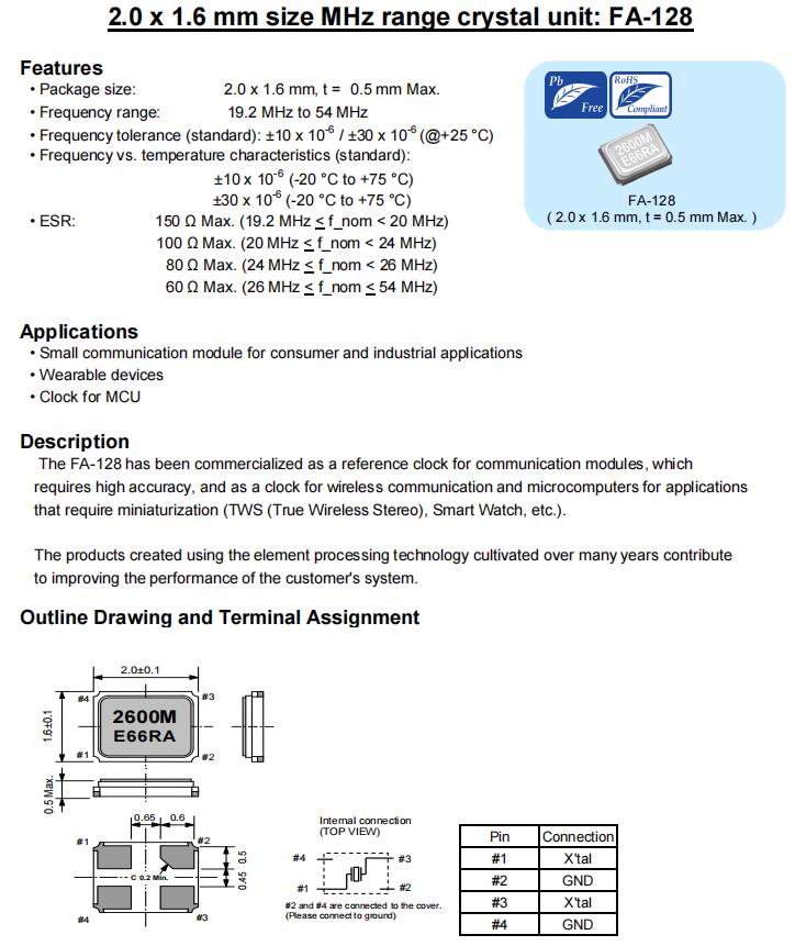 Q22FA12800170 | 2 x 1.6 x 0.5mm | FA-128 | 26.000000 MHz | 6 pF | +/-10 ppm | -20 to +75 °C |