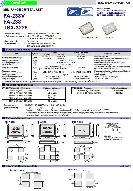 (2) 在設(shè)計(jì)時(shí)請參考相應(yīng)的推薦封裝.愛普生晶振FA-238,Q22FA23800047無源貼片晶振