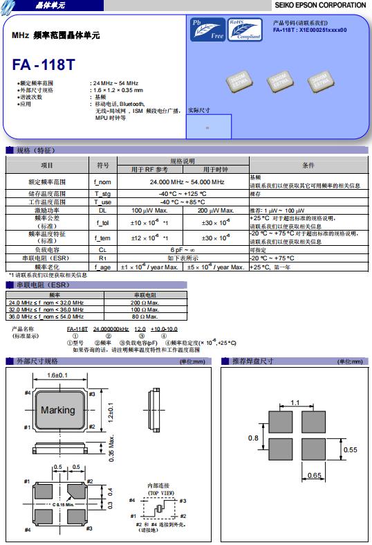 日本愛普生晶振FA-118T,X1E0002510032無源諧振器,EPSON進口晶振,音叉晶體,水晶振動子,無源晶體,石英貼片晶振,型號FA-118T,編碼X1E0002510032是一款金屬面貼片型的石英晶體,采用先進的生產技術制作而成,尺寸為1612mm,頻率40MHZ,負載10pF,精度10ppm,工作溫度-20to+75°C,產品具有超高的可靠性能和耐壓性能,適合用于智能家居,通信設備,無線模塊等領域.