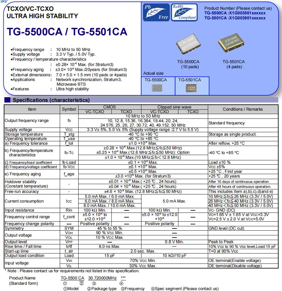 X1G0039010200 | TG-5501CA | 30.720000 MHz | 7.00 x 5.00 x 1.50 mm | Clipped sine wave | 3.135 to 3.465 V | +/-1.0 ppm | -40 to +85 °C |