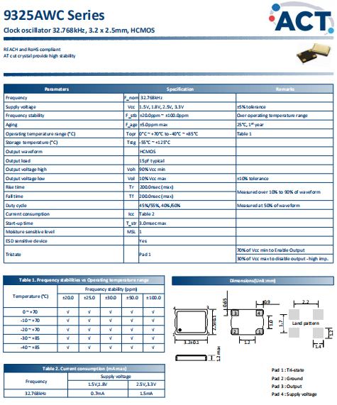 ACT晶振,9325AWC晶振,石英晶體振蕩器.3225mm體積的晶振,可以說是目前小型數(shù)碼產(chǎn)品的福音,目前超小型的智能手機(jī)里面所應(yīng)用的就是小型的石英晶振,該產(chǎn)品最適用于無線通訊系統(tǒng),無線局域網(wǎng),已實(shí)現(xiàn)低相位噪聲,低電壓,低消費(fèi)電流和高穩(wěn)定度,超小型,質(zhì)量輕等產(chǎn)品特點(diǎn),產(chǎn)品本身編帶包裝方式,可對(duì)應(yīng)自動(dòng)高速貼片機(jī)應(yīng)用,以及高溫回流焊接(產(chǎn)品無鉛對(duì)應(yīng)),為無鉛產(chǎn)品.