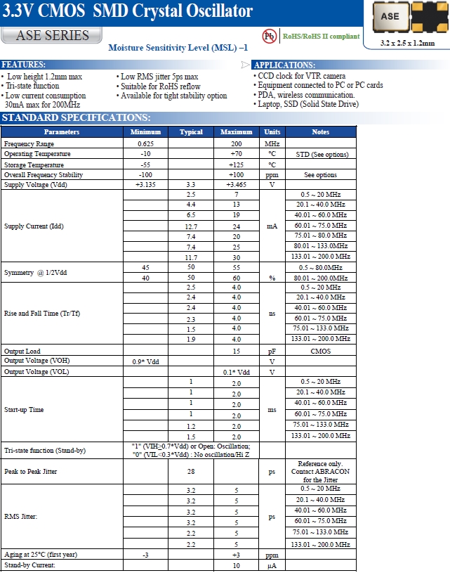 Abracon晶振,ASE-25.000MHZ-LR-T振蕩子,ASE壓電晶振.小型貼片有源晶振,體積的變小也使產(chǎn)品帶來了更高的穩(wěn)定性能,接縫密封石英晶體振蕩器,精度高,覆蓋頻率范圍寬的特點,貼片高速自動安裝和高溫回流焊設(shè)計,Optionable待機輸出三態(tài)輸出功能,電源電壓范圍:1.8V?5V,高穩(wěn)定性,低抖動,低功耗,主要應用領(lǐng)域:無線通訊,智能手機,平板筆記本W(wǎng)LAN,藍牙,數(shù)碼相機,DSL和各式IT產(chǎn)品的晶振應用,三態(tài)功能,PC和LCDM等數(shù)碼領(lǐng)域,符合RoHS/無鉛.