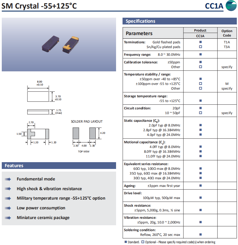 Golledge晶振,貼片石英晶振,CC1A石英晶體諧振器.石英貼片晶振,體積小,焊接可采用自動貼片系統(tǒng),產(chǎn)品本身小型,表面貼片晶振,特別適用于有小型化要求的電子數(shù)碼產(chǎn)品市場領(lǐng)域,因產(chǎn)品小型,薄型優(yōu)勢,耐環(huán)境特性,包括耐高溫,耐沖擊性等,在移動通信領(lǐng)域得到了廣泛的應(yīng)用,晶振產(chǎn)品本身可發(fā)揮優(yōu)良的電氣特性,滿足無鉛焊接的高溫回流溫度曲線要求.