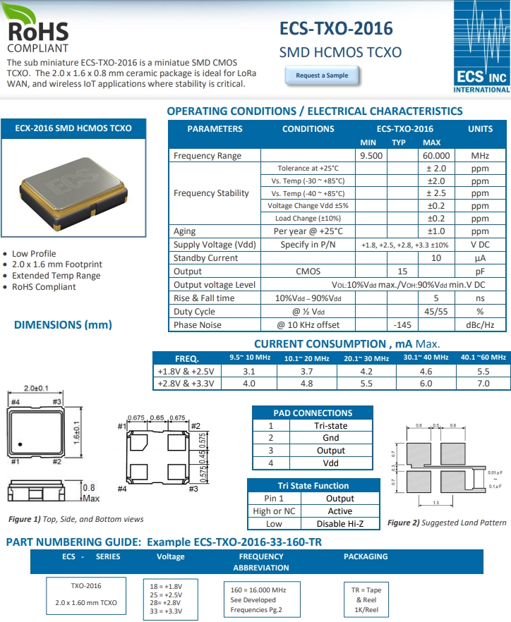 ECS晶振,有源晶振,ECS-TXO-2016溫補(bǔ)晶振.小型,輕型,低消耗電流,表面貼片型產(chǎn)品.(可對(duì)應(yīng)回流焊)無(wú)鉛產(chǎn)品.滿足無(wú)鉛焊盤(pán)的高溫回流溫度曲線要求,帶有AFC(頻率控制)功能,Enable/Disable功能,產(chǎn)品本身可根據(jù)使用需要進(jìn)行選擇.