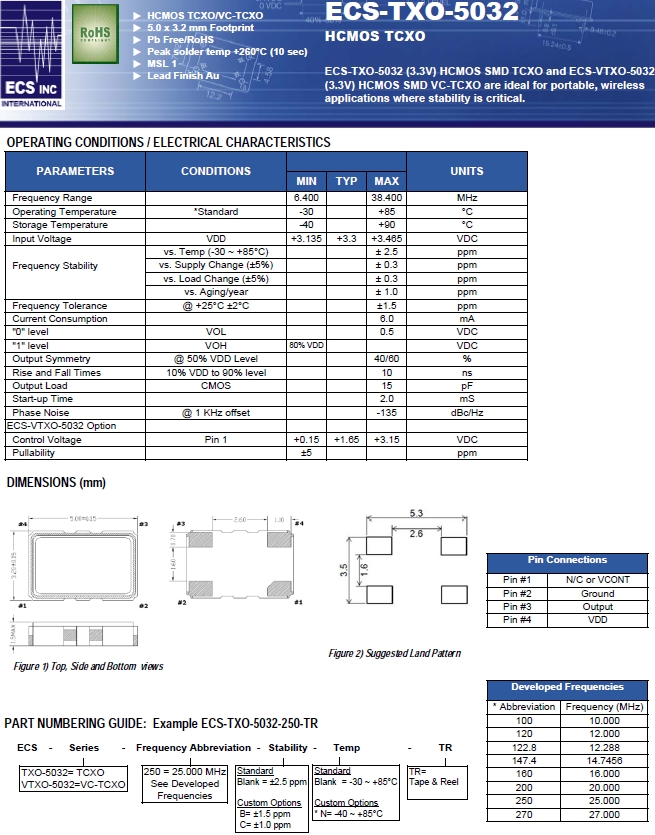 ECS晶振,ECS-TXO-5032-270-TR石英振蕩器,ECS-TXO-5032有源晶體.溫補晶振(TCXO)產品本身具有溫度補償作用,高低溫度穩定性:頻率精度高0.5 PPM-2.0 PPM,工作溫度范圍:-30度至85度,電源電壓:1.8V-3.3V之間可供選擇,產品本身具有溫度電壓控制功能,世界上較薄的晶振封裝,頻率:26兆赫,33.6兆赫,38.4兆赫,40兆赫,因產品性能穩定,精度高等優勢,被廣泛應用到一些比較有品質的數碼通訊產品領域,導航定位系統,智能手機,WiMAX和蜂窩和無線通信等產品,符合RoHS/無鉛.