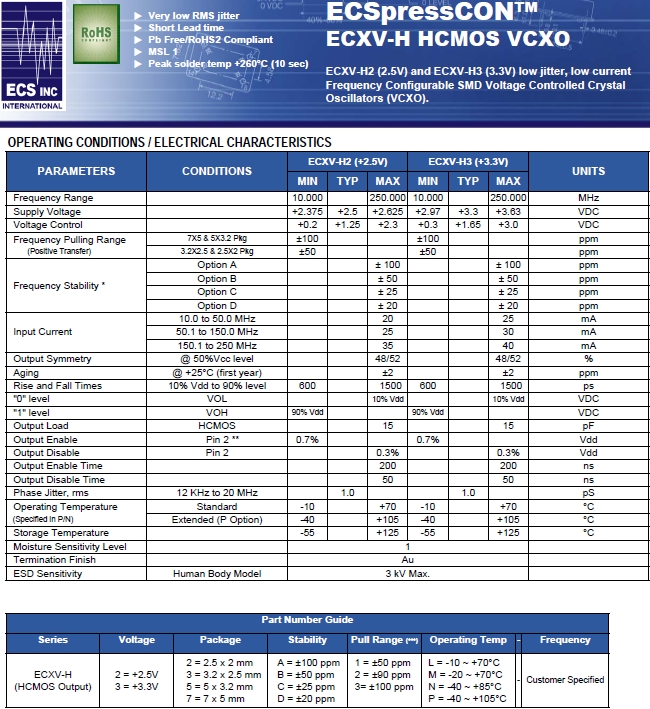 ECS晶體,ECS振蕩器,ECXV-H2壓電晶振.有源晶振,是只晶體本身起振需要外部電壓供應,起振后可直接驅動CMOS集成電路,產品本身已實現與薄型IC(TSSOP封裝,TVSOP封裝)同樣的1mm厚度,斷開時的消費電流是15µA以下,編帶包裝方式可對應自動搭載及IR回流焊盤(無鉛對應)產品有幾種電壓供選1.8V,2.5V,3V3.3V,5V,以應對不同IC產品需要.