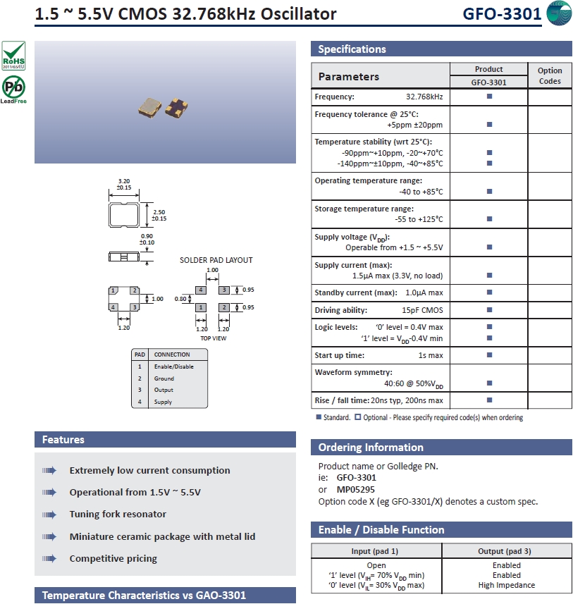 Golledge晶振,時鐘振蕩器,GFO-3301貼片晶振.小體積貼片時鐘晶體諧振器,是貼片音叉晶體,千赫頻率元件,應用于時鐘模塊,智能手機,導航定位系統,因產品本身體積小,貼片編帶型,可應用于高性能自動貼片焊盤,被廣泛應用到各種小巧的便攜式消費電子數碼時間產品,環保性能符合ROHS/無鉛認證.
