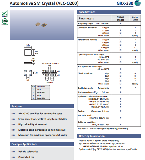 Golledge晶振,GRX-330晶振,高精度石英晶體.智能手機晶振,產品具有高精度超小型的表面貼片型石英晶體諧振器,最適用于移動通信終端的基準時鐘等移動通信領域.比如智能手機,無線通信,衛星導航,平臺基站等較高端的數碼產品,晶振本身小型,薄型具備各類移動通信的基準時鐘源用頻率,貼片晶振具有優良的電氣特性,耐環境性能適用于移動通信領域,滿足無鉛焊接的高溫回流溫度曲線要求.