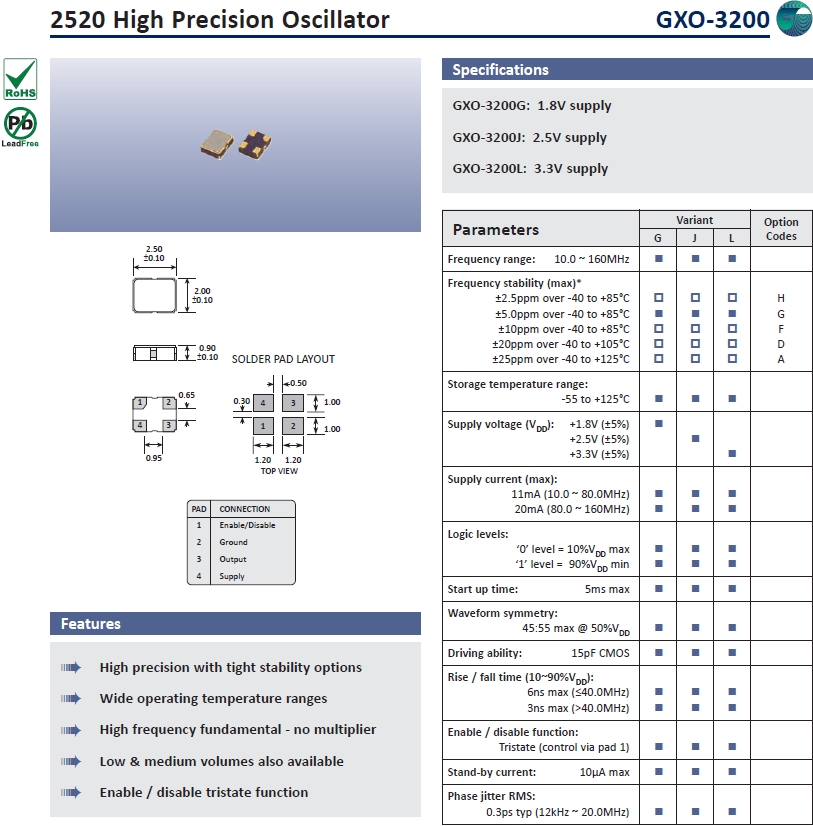 Golledge晶體,高利奇晶振,GXO-3200水晶振蕩子.小型貼片有源晶振,體積的變小也使產品帶來了更高的穩定性能,接縫密封石英晶體振蕩器,精度高,覆蓋頻率范圍寬的特點,貼片高速自動安裝和高溫回流焊設計,Optionable待機輸出三態輸出功能,電源電壓范圍:1.8V?5V,高穩定性,低抖動,低功耗,主要應用領域:無線通訊,智能手機,平板筆記本WLAN,藍牙,數碼相機,DSL和各式IT產品的晶振應用,三態功能,PC和LCDM等數碼領域,符合RoHS/無鉛.