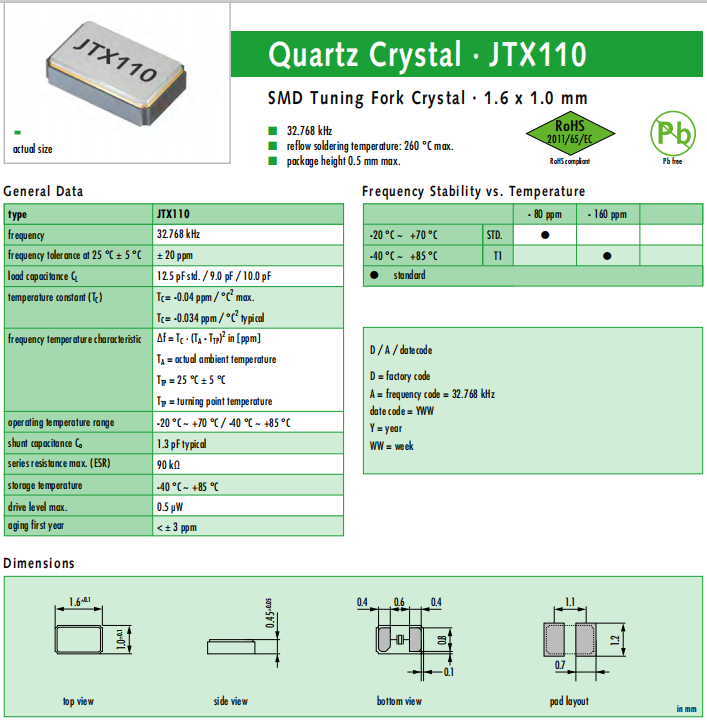JAUCH晶振,JTX110晶振,32.768K無源晶體.普通貼片石英晶振外觀使用金屬材料封裝的,具有高穩定性,高可靠性的石英晶體諧振器,晶振外觀本身使用金屬封裝,充分的密封性能,可確保其高可靠性,采用編帶包裝,外包裝采用朔膠盤,可在自動貼片機上對應自動貼裝等優勢.