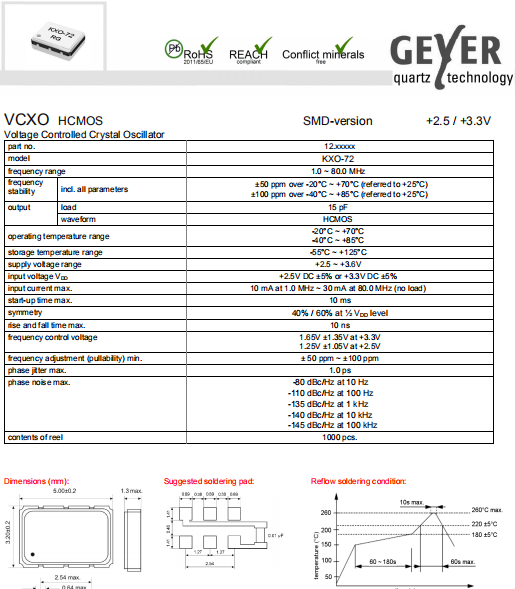 Geyer晶振,KXO-72晶振,環(huán)保振蕩器.具有最適合于移動(dòng)通信設(shè)備用途的高穩(wěn)定的頻率溫度特性.為對(duì)應(yīng)低電源電壓的產(chǎn)品.(可對(duì)應(yīng)DC +1.8 V±0.1 V to +3.2 V±0.1 V )高度:最高1.0 mm,體積:0.007 cm3,重量:0.024g,超小型,輕型.低消耗電流,表面貼片型產(chǎn)品.(可對(duì)應(yīng)回流焊) 無鉛產(chǎn)品.滿足無鉛焊接的回流溫度曲線要求.