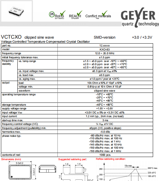 Geyer晶振,KXO-83晶振,壓控溫補晶振.小型SMD有源晶振,從最初超大體積到現(xiàn)在的7050mm,6035mm,5032mm,3225mm,2520mm體積,有著翻天覆地的改變,體積的變小也使產(chǎn)品帶來了更高的穩(wěn)定性能,接縫密封石英晶體振蕩器,精度高,覆蓋頻率范圍寬的特點,SMD高速自動安裝和高溫回流焊設(shè)計,Optionable待機輸出三態(tài)輸出功能,電源電壓范圍:1.8V?5 V,高穩(wěn)定性,低抖動,低功耗,主要應(yīng)用領(lǐng)域:無線通訊,高端智能手機,平板筆記本W(wǎng)LAN,藍牙,數(shù)碼相機,DSL和其他IT產(chǎn)品的晶振應(yīng)用,三態(tài)功能,PC和LCDM等高端數(shù)碼領(lǐng)域,符合RoHS/無鉛.
