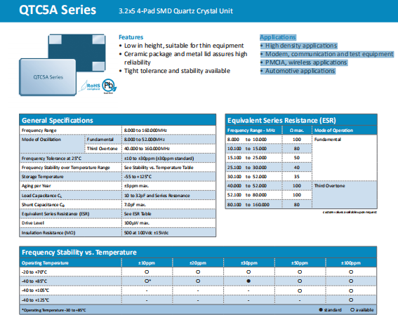 Quarztechnik晶振,QTC5A晶振,高性能石英晶體.小體積貼片5032晶振,外觀小型,表面貼片型石英晶體諧振器,因本身體積小等優(yōu)勢(shì),適用于移動(dòng)通信終端的基準(zhǔn)時(shí)鐘等移動(dòng)通信領(lǐng)域.小型,薄型,輕型(5.0×3.2×0.8mmtyp.)具備優(yōu)良的耐環(huán)境特性及高耐熱性強(qiáng).滿足無鉛焊接的回流溫度曲線要求.