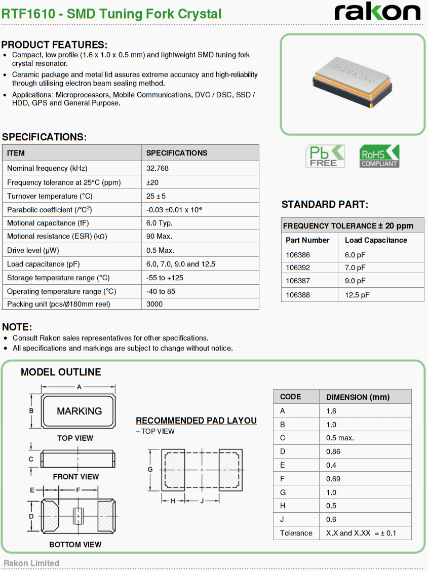 Rakon晶振,RTF1610晶振,音叉石英晶體.超小型,薄型,質地輕的表面貼片音叉型晶體諧振器,手機晶體,產品體積小,特別適用于各種小巧的便攜式消費電子數碼產品,在移動通信領域得到了廣泛的應用,貼片晶振產品本身可發揮優良的電氣特性,滿足無鉛焊接的高溫回流溫度曲線要求.