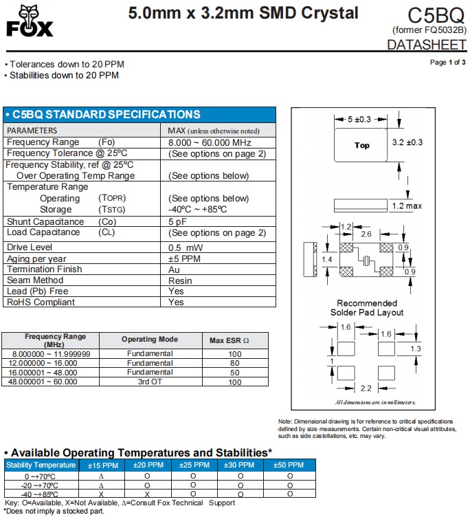 FQ5032BR-16.000 | Fox晶振 | C5BQ | 16MHz | 4-SMD, No Lead | ±50ppm |