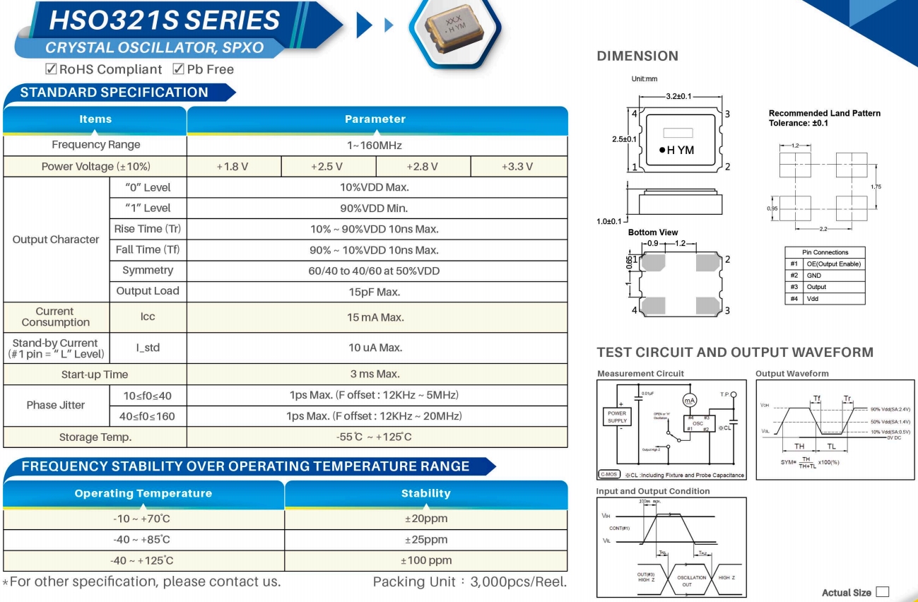 加高HSO321S有源晶振,8MHZ石英振蕩器,SSW008000I3CHE-T 參數表