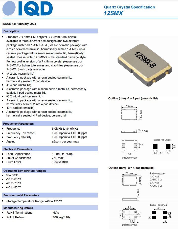 LFXTAL026388REEL | IQD晶振 | 12SMX-B | CRYSTAL 14.7456MHZ 16PF SMD | 14.7456 MHz |