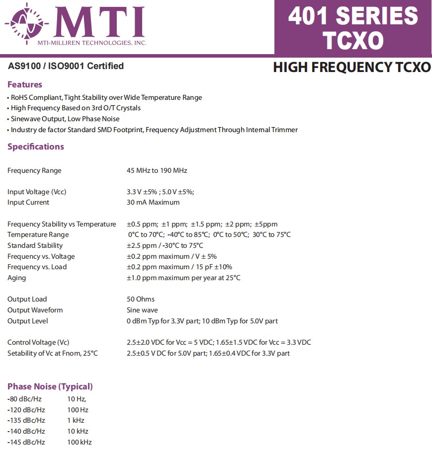 MTI-milliren米利倫晶振,401系列TCXO振蕩器,低相位噪聲晶振,GPS定位晶振,通訊設(shè)備晶振,參數(shù)表