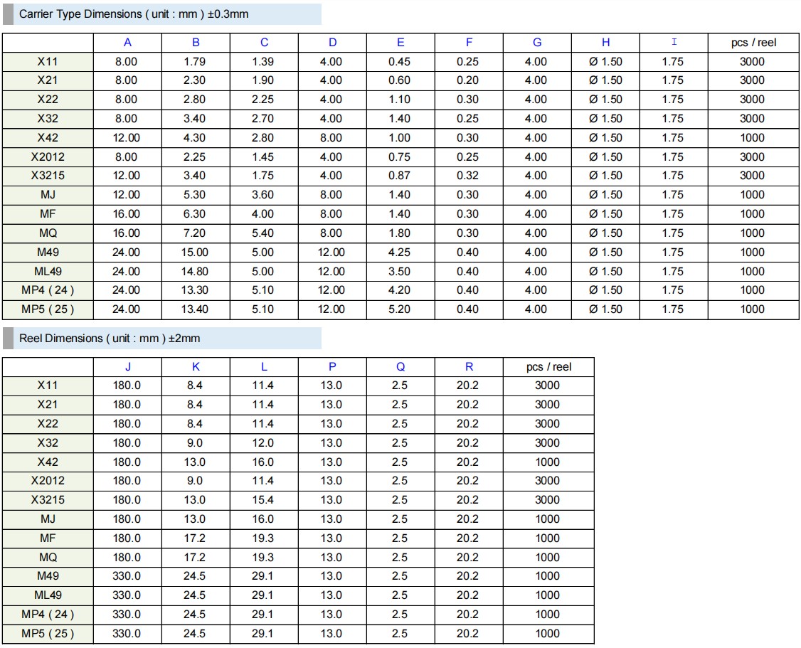 Item / Type | X11 ( 1.6*1.2*0.4mm ) | X21 ( 2.0*1.6*0.5mm ) | X22 ( 2.5*2.0*0.6 mm ) | X32 ( 3.2*2.5*0.7mm ) |