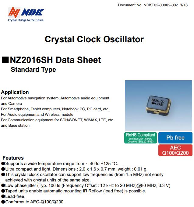 NDK汽車電子專用晶振|NZ2016SH-24.000MHZNSC5022C|2016|1.8V,是一款金屬面貼片型的有源晶振,NDK車規(guī)晶振,汽車電子專用晶振,日本進口晶振,石英晶體振蕩器,OSC振蕩器,SMD振蕩器,寬溫晶振,產(chǎn)品特點:支持- 40至+125°C的寬溫度范圍。小巧輕便。尺寸2.0x 1.6x 0.7mm,這種晶體時鐘振蕩器可以支持低頻率(從1.5MHz),用相同尺寸的晶體單元實現(xiàn)。低相位抖動(類型:100fs(頻率偏移:12khz至20mhz)@ 80mhz, 3.3 V),膠帶裝置可自動安裝紅外回流管(無鉛)。應(yīng)用領(lǐng)域:汽車導(dǎo)航系統(tǒng)、汽車音響設(shè)備和攝像機 智能手機、平板電腦、筆記本電腦、PC卡等。 音頻設(shè)備和無線模塊,基站等領(lǐng)域。