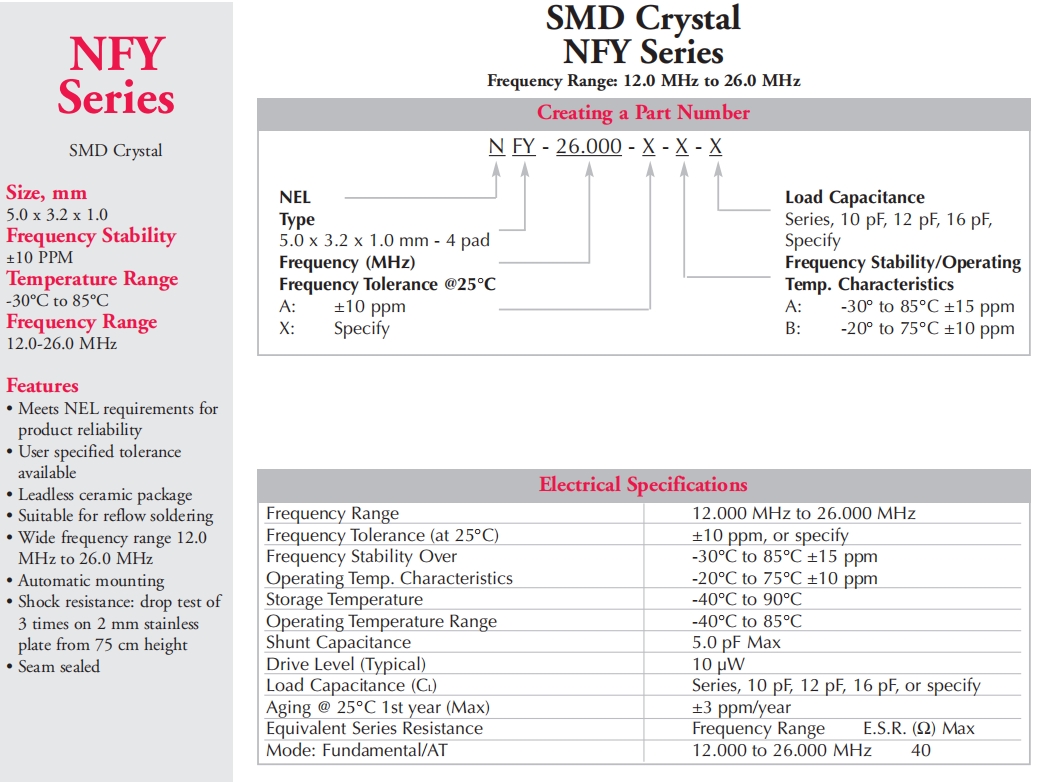 美國耐爾無源晶體,6G藍牙晶振,NFY-16.000-A-B-10 參數表