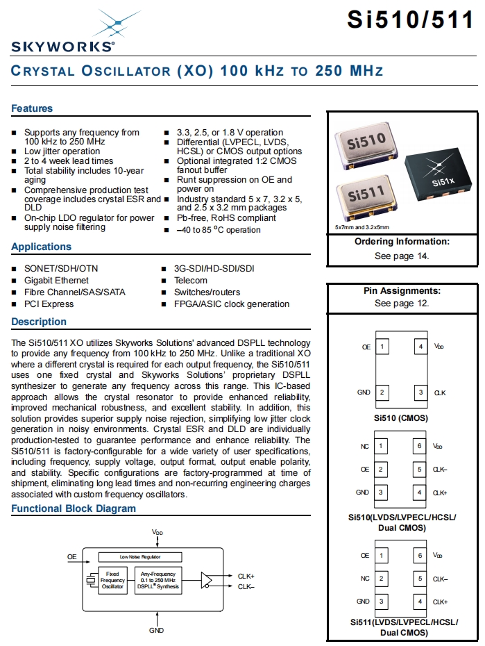 510JBA50M0000CAGR | Skyworks有源晶振 | DIFFERENTIAL/SINGLE-ENDED; SINGL | Si510 | 50 MHz | LVDS | 1.8V |
