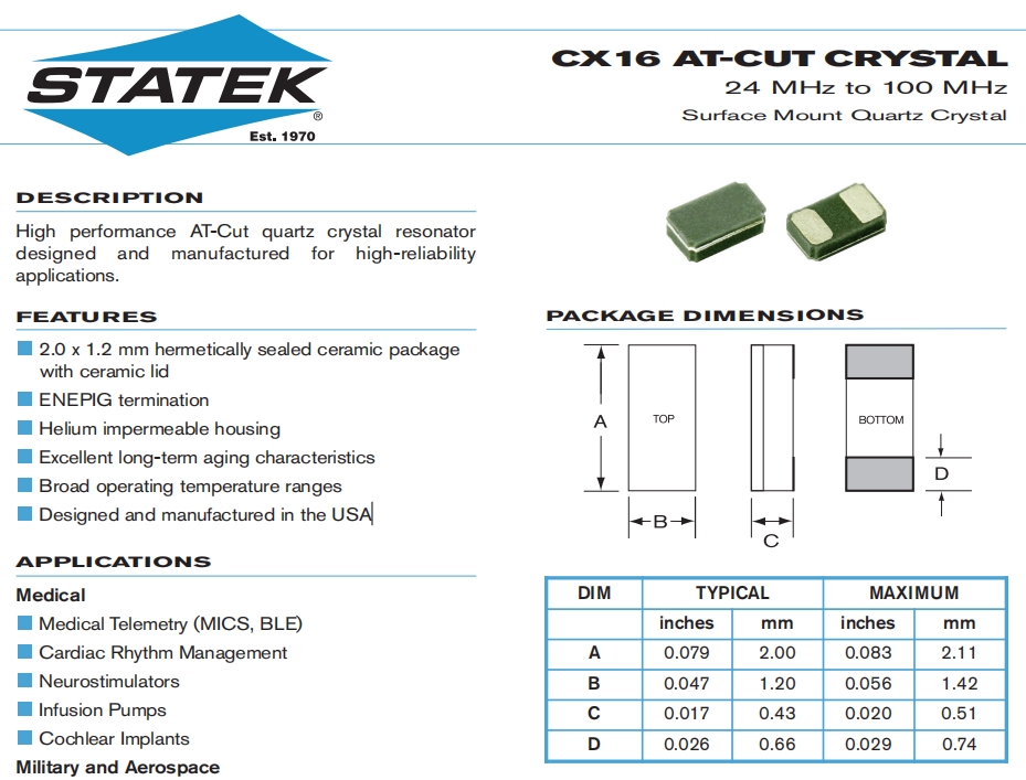 6G通訊晶振,美國Statek斯塔克晶體,CX16SCSM1-48.0M,20/10/-/S,9pF,尺寸2012mm,頻率48MHZ,Statek無源晶振,美國斯塔克晶振,歐美進(jìn)口晶振,水晶振動子,兩腳貼片晶振,貼片無源晶振,輕薄型晶振,2012mm音叉晶體,無源音叉晶體,無源貼片晶振,無源晶振,SMD晶體諧振器,兩腳貼片晶振,陶瓷晶振,航空航天晶振,軍事應(yīng)用晶振,數(shù)據(jù)通信晶振,通訊設(shè)備晶振,計(jì)算機(jī)專用晶振,脈沖發(fā)生器晶振,高品質(zhì)晶振,高性能晶振,低損耗晶振,低成本晶振。高性能AT切割石英晶體諧振器設(shè)計(jì)和制造具有高可靠性應(yīng)用程序。