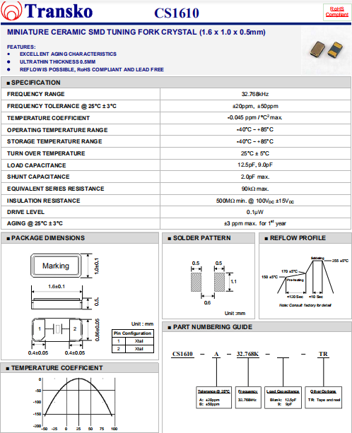 Transko晶振,CS1610晶振,進口音叉石英晶體,超小型,薄型,質地輕的表面貼片音叉型石英晶體諧振器,手機晶體,產品體積小,特別適用于各種小巧的便攜式消費電子數碼產品,在移動通信領域得到了廣泛的應用,晶振產品本身可發(fā)揮優(yōu)良的電氣特性,滿足無鉛焊接的高溫回流溫度曲線要求.