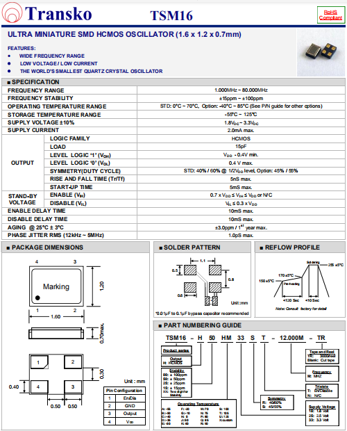 Transko晶振,TSM16晶振,高精度晶振.小體積SMD時(shí)鐘晶體振蕩器,是貼片石英晶振,兆赫頻率元件,應(yīng)用于時(shí)鐘模塊,智能手機(jī),全球定位系統(tǒng),因產(chǎn)品本身體積小,SMD編帶型,可應(yīng)用于高性能自動(dòng)貼片焊接,被廣泛應(yīng)用到各種小巧的便攜式消費(fèi)電子數(shù)碼時(shí)間產(chǎn)品,環(huán)保性能符合ROHS/無(wú)鉛標(biāo)準(zhǔn).