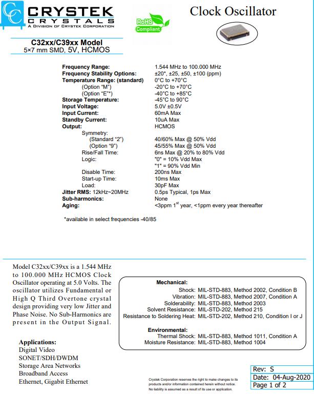 CE3391-7.372800 | CRYSTEK振蕩器 | C33 | XO (Standard) | 7.3728MHz | ±25ppm | -40°C ~ 85°C |