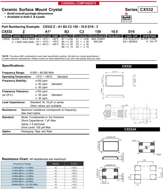 CX532Z-A2B3C5-70-50.0D18 | Cardinal晶振 | CRYSTAL 50.0000MHZ 18PF SMD | CX532 | 50MHz | ±30ppm | 70 Ohm | -40°C ~ 85°C |