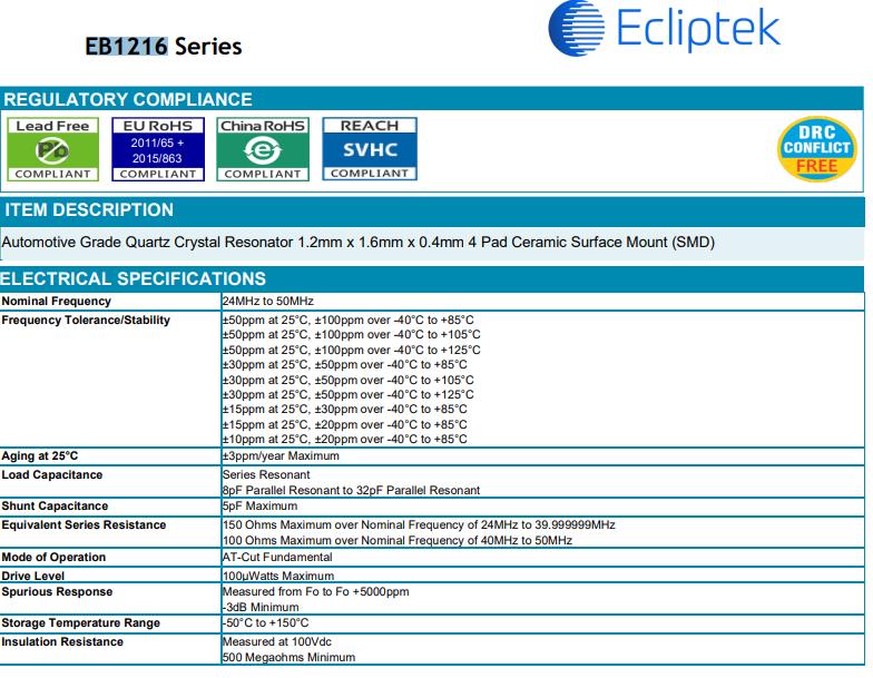 EB3250AYA08-16.000M TR Ecliptek晶振 CRYSTAL 16.0000MHZ 8PF SMD -40°C ~ 125°C