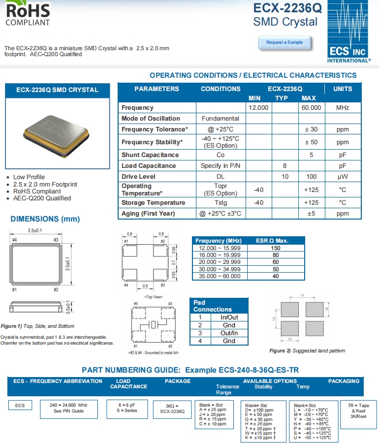 ECS-300-10-36Q-ES-TR | ECS晶振 | ECX-2236Q | 30MHz | -40°C ~ 125°C |