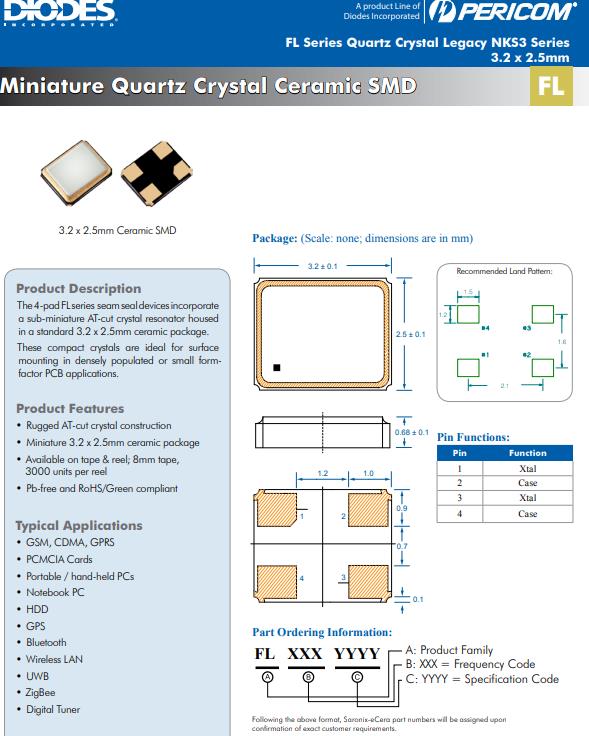 編碼FL2500047是一款4墊FL系列接縫密封裝置,一個超微型at切割石英晶體諧振器,采用標準3.2 x 2.5mm陶瓷封裝。這些致密的晶體是理想的表面安裝在人口密集或小尺寸PCB應用。