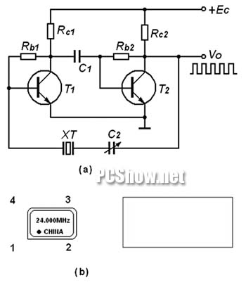 壓電諧振狀態(tài)的建立和維持都必須借助于振蕩器電路才能實現(xiàn)。圖3是一個串聯(lián)型振蕩器,晶體管T1和T2構(gòu)成的兩級放大器,石英晶體XT與電容C2構(gòu)成LC電路。在這個電路中,石英晶體相當于一個電感,C2為可變電容器,調(diào)節(jié)其容量即可使電路進入諧振狀態(tài)。該振蕩器供電電壓為5V,輸出波形為方波《有源晶振引腳》有源晶振與無源晶振
