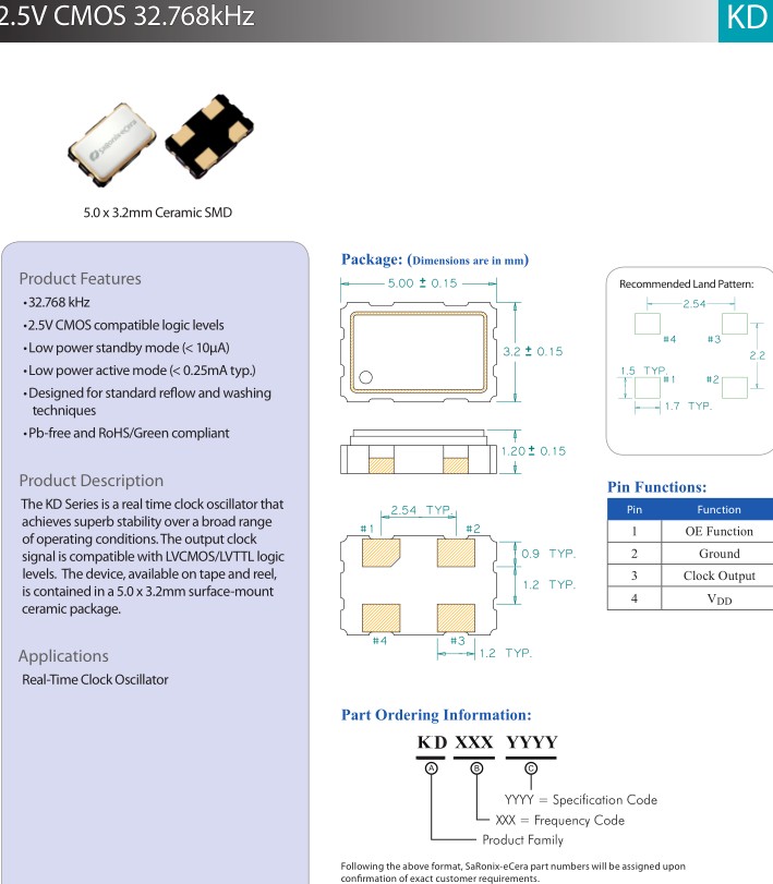 KD系列是一個實時時鐘晶體振蕩器在廣闊的范圍內實現卓越的穩定性的操作條件。輸出時鐘信號兼容LVCMOS/LVTTL邏輯的水平。這種設備可以通過磁帶和卷軸獲得,是包含在5.0 x 3.2mm表面安裝陶瓷包裝。