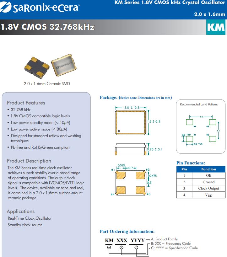 KM3270002特性:32.768千赫,1.8V CMOS兼容邏輯電平,低功耗待機(jī)模式(< 10μA),低功率有功模式(< 80μA),設(shè)計(jì)為標(biāo)準(zhǔn)回流和清洗技術(shù),無(wú)鉛,符合RoHS/綠色標(biāo)準(zhǔn)