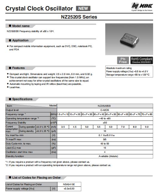 NZ2520SA-2.750000MHZ | NDK振蕩器 | NZ2520SA | 2.75MHz | 3V |