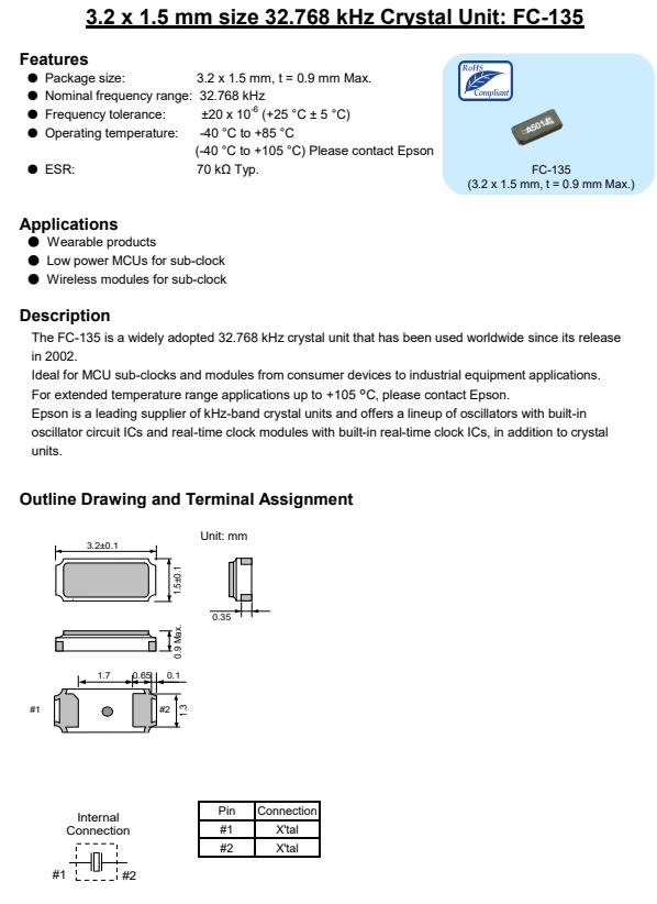 Q13FC1350006000 | 3.2 x 1.5 x 0.9 mm | FC-135 | 32.768kHz | 6 pF | +/-10.0 ppm | -40 to +85 °C |