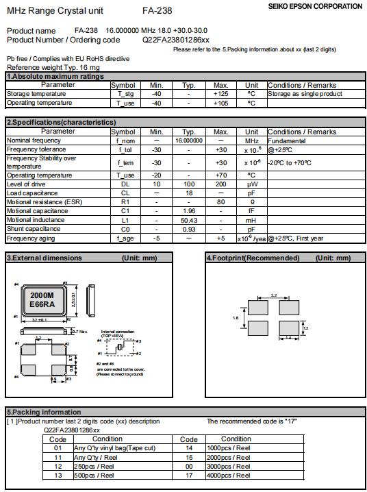 Q22FA2380128616 | 3.2 x 2.5 x 0.7mm | FA-238 | 16.000000 MHz | 18 pF | +/-30 ppm | +/-30 ppm | -20 to +70 °C | ≤ 80 Ω |