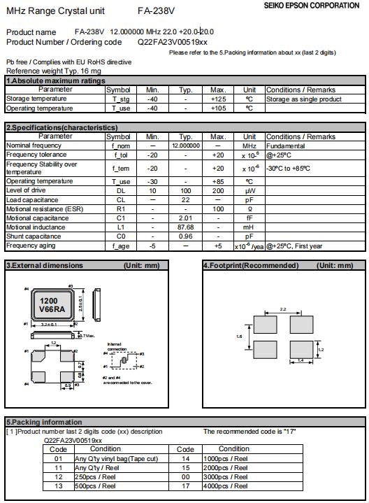 Q22FA23V0051916 | 3.2 x 2.5 x 0.7mm | FA-238V | 12.000000 MHz | 22 pF | +/-20 ppm | +/-20 ppm | -30 to +85 °C | ≤ 100 Ω |