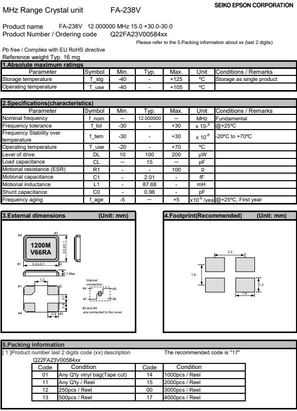 Q22FA23V0058416 | 3.2 x 2.5 x 0.7mm | FA-238V | 12.000000 MHz | 15 pF | +/-30 ppm | +/-30 ppm | -20 to +70 °C |